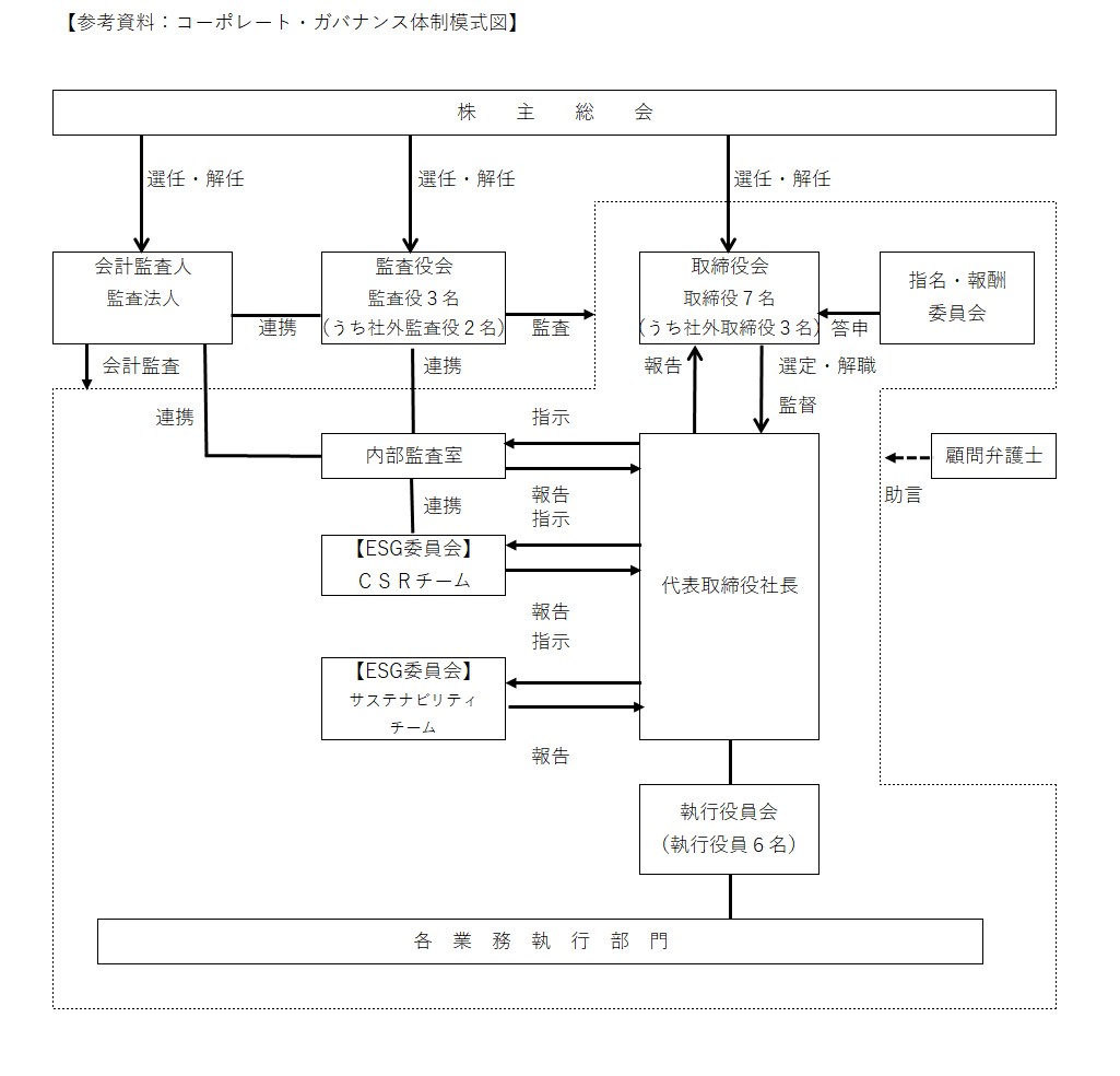 当社では、業務執行上の最高意思決定機関といたしまして取締役会を毎月1回程度開催しております。株主の皆様の負託に応えるべく当社グループの持続的成長と中長期的な企業価値の向上に向けて、経営の基本方針や法令・定款で定められている事項ならびに経営に関する重要事項の審議・承認・決定、取締役の職務の執行の監視・監督が執り行われております。取締役会は、取締役7名、そのうち社外取締役を3名置く体制としております。社外取締役には、豊富な経験と見識、専門的かつ高度な視点から経営全般への助言をいただくとともに、監視・監督機能を高めることを目的として、その任にあたっていただいております。また3名とも当社「社外役員の選任ならびに独立性に関する基準」を満たしており、当社との間に利害関係がなく一般株主との利益相反のおそれがないことから、独立役員に指定しております。当社は2017年7月26日の取締役会にて、取締役会の諮問機関として任意の「指名・報酬委員会」を設置することを決議いたしました。委員長を社外取締役とし、過半数を社外役員とした当委員会は、社外役員の知見および助言を活かすとともに、役員の指名および報酬の決定に関する手続きの客観性および透明性を確保するものです。当委員会では当社の役員候補者の指名方針、役員候補者の選任議案、報酬に関する基本方針、取締役の報酬基準と適用等について審議・助言をいたします。監査役会は、3名で構成されており、そのうち2名は社外監査役であります。随時監査役会が執り行われているほか、監査役全員が取締役会に出席して取締役の職務の執行状況の監査・監督を行い、かつ広範にわたる業務の監査を実施いたしております。